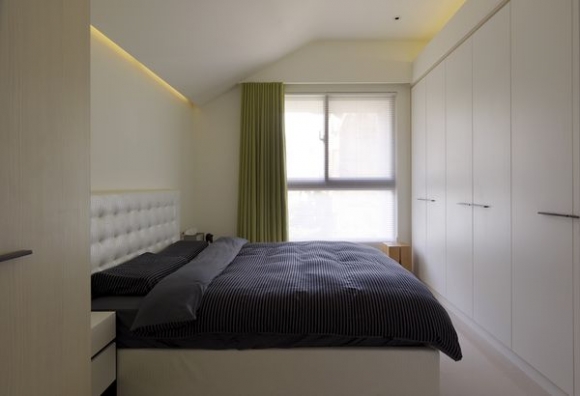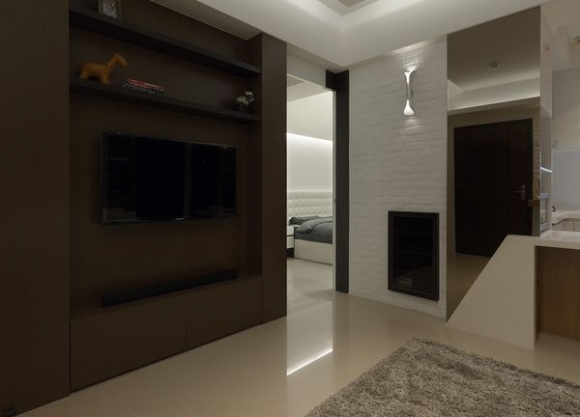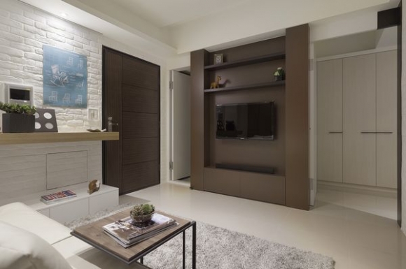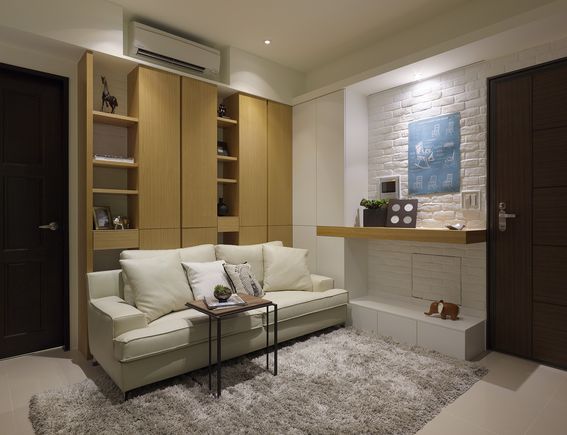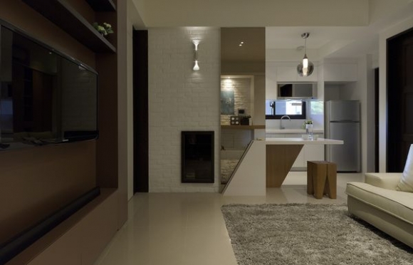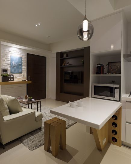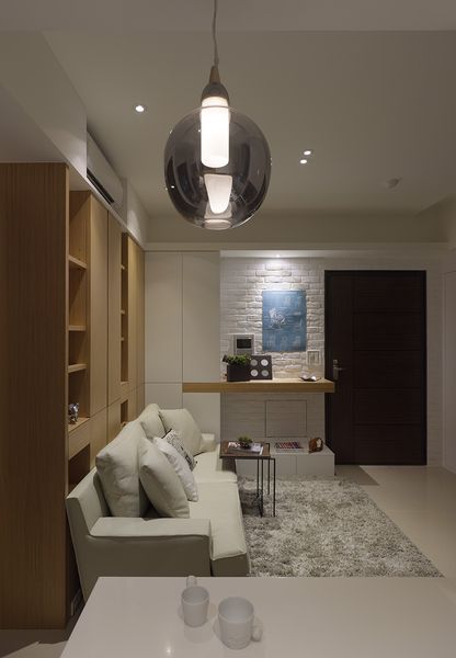 甫一進門,便可看到白色文化石帶來的休閒感,為客廳帶來簡潔清爽的氛圍。木質電視牆,回歸純粹的表情,呈現出沉穩大器的氣度。而收納機能也是設計師所重視的,以高櫃取代傳統的沙發背牆設計,兼具機能性外,也豐富了視覺層次。餐、廚區採開放式設計,讓空間能更加寬闊,視線更為流暢。主卧室透過斜向線條的轉折,避開了床頭上方樑體的壓迫。