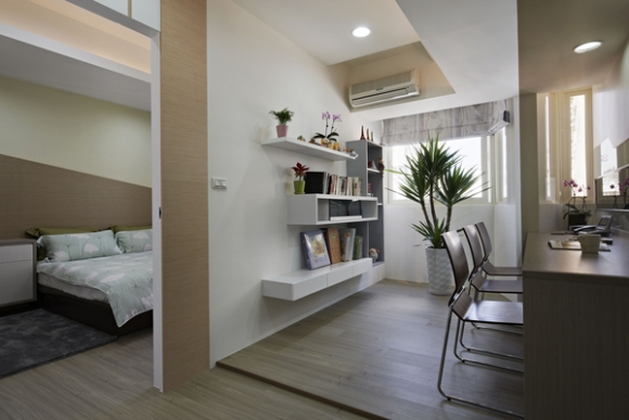 之前書房位置作為洗衣房,空間又小又封閉,如今改作書房。因為只有夫妻倆人居住,平日很安靜。因此,採開放設計可享受通透的優點,也不擔心被干擾的問題。在設計上沿著建築造型的內凹設計做為書桌與房間的牆線,如此可避開畸零角的問題,而背後則以層板與開放書櫃設計避免狹隘感受。除了在書房側板上以玻璃取代隔間牆,書桌與主臥室間的實牆上也特意覆上二段式玻璃造型,一來可呼應玄關的裝飾牆的設計語彙;另外,也讓書房的寬度有加倍的感受,視線也可因為有延伸感而達到紓放的效果。