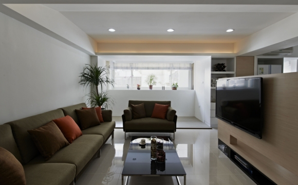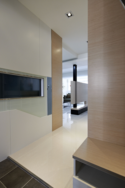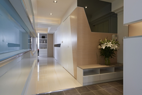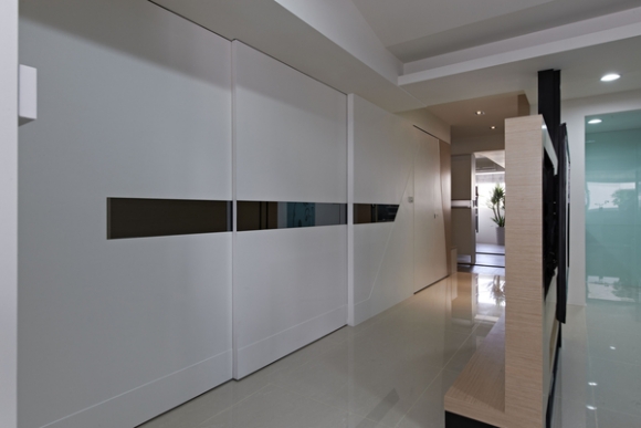 因為前任屋主內部的格局與屋主的需求與期望完全不同,因此,此次裝修除廚房位置不變外,室內格局完全拆掉重新規劃,如此也更能量身訂製出新屋主的生活動線。由於屋主希望為孩子預留一間客房,所以30坪室內先空出二房後,其餘則多以開放設計。從玄關入門先面對玻璃端景牆,向右側為客廳、餐廳與廚房、更衣間,而左側則作為主臥室、書房與客房。特別的是,屋主要求直接將更衣間移出主臥房,配置在玄關與廚房間的過道上,除了讓臥室更顯清幽外,也將過道上不大不小的畸零空間做了最好運用;而廚房與更衣間以折疊門與拉門設計,在需要時可以整個關上遮掩廚房內的雜亂,也可作為客廳大裝飾牆。另外,客廳旁有小和室,這是專為屋主保留作為養花植草的溫室休閒區。至於玄關另一側的書房作開放設計,讓屋內的左右視野串聯暢通,更是成功地拉大了空間格局與氣勢。