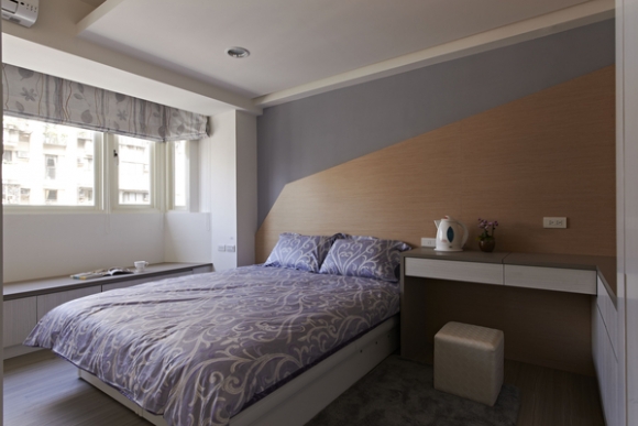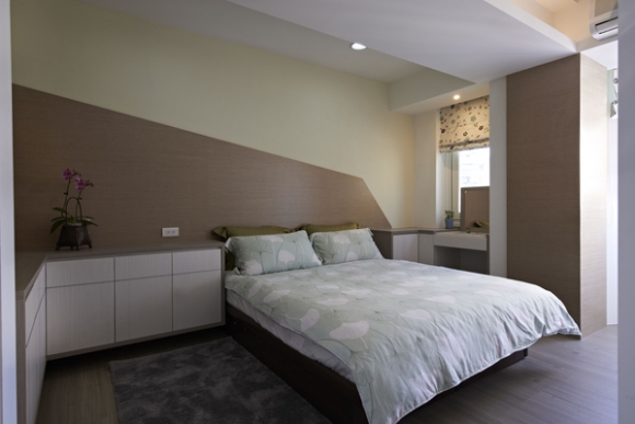 原本主臥室位置因有浴室遮擋而無對外窗,現在不但有對外窗,還有矮櫃座榻設計可眺望窗景;另外,在床頭部分則以木作與漆作設計來取代有厚度的床頭板設計,可省下更多空間喔!因為將浴室規劃在主臥室門口外,加上將更衣間移出至玄關旁,讓房間內沒有門片的雜亂感,同時也少了衣櫥高櫃的干擾而顯得寬鬆許多,而在機能上仍保有電視牆、化妝桌與半高矮櫃等收納設計。