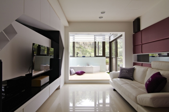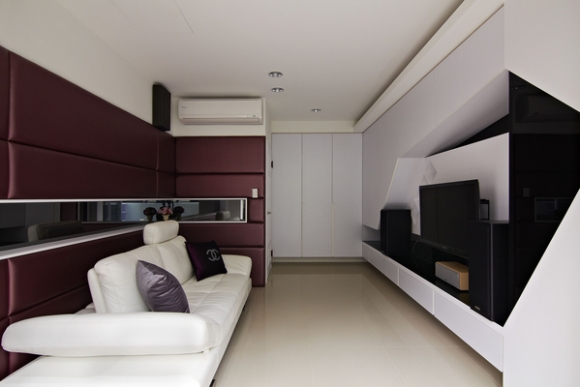 女兒平日在台北上班,假日回基隆家住,一個大房間只做女兒房好像效益不高,但不留房間女兒又會抗議,那就一起吧!先用沙發床取代床鋪,而電視主牆則以黑白幾何設計,並穿插視聽設備與CD的收納設計做出時尚造型櫃牆,而陽台旁規劃架高木地板配合矮櫃設計,讓親友唱KTV或看影片時都能更輕鬆自在。