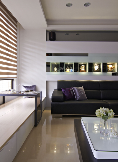 喜歡出國旅行的屋主夫婦,常常在旅程中帶回一些精緻的特色紀念品,為了讓這些嬌客有地方好好秀一下,在沙發主牆特別以精品櫃的概念設計展示櫃,在裝飾灰鏡線條與塊面讓畫面更活潑。窗邊利用建築的造型設計座榻區,此設計讓客廳在家族聚會時可增加不少座位;當然,平時夫妻也可愜意地閒坐在此喝杯咖啡。座位中的茶几特別作可移動式設計,要靠牆、擺中央都可以,使用起來更方便,而座位下當然也不忘設計有收納機能。