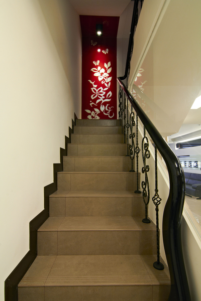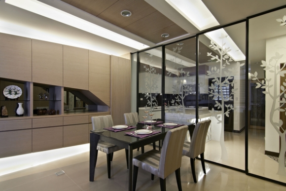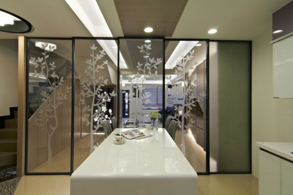 屋主極重視節能減碳,特別要求餐廳與廚房要區隔以避免冷氣外漏,但從設計面考量空間的穿透感,所以決定以鐵件細框與清玻璃設計成四片推門,平時可移至中島與餐桌間作保持開放格局,而且變成優美的植物疊影屏風,而關上也不至於讓空間太封閉。另外,畫面右側就是電梯出口囉!為了畫分玄關位置,地板上可以看到用不一樣的金屬與大理石馬賽克磚作區隔,搭配天花板燈造型,是不是更有玄關的獨立感!