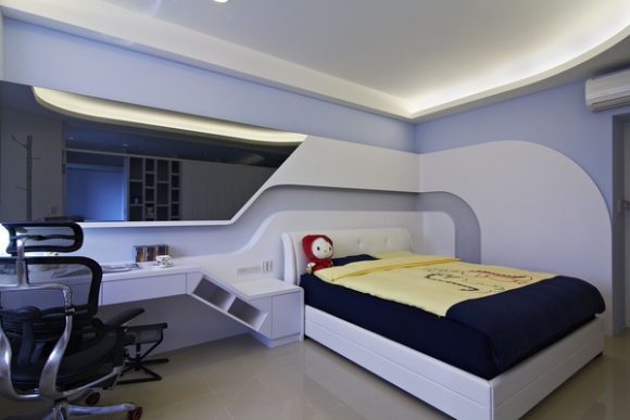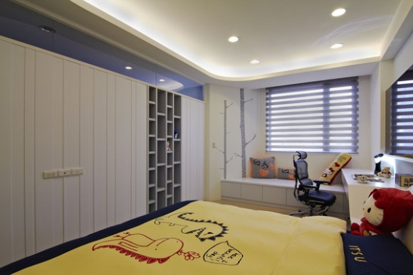 兒子房與樓下客廳屬同方位,可利用窗戶旁增加座區來提升休閒機能,書桌則延伸至窗邊讓桌板更大、更好用,窗邊白色壁面上的壁貼圖是兒子自己挑的,這些細節也讓居住者對自己的空間有更多參與感。床尾設有電視主牆,除了上方以玻璃來增加與更衣間的互動性,也利用書櫃的設計讓畫面更具有變化性。