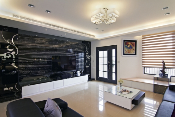 為了突顯透天建築的穩重性,以符合屋主的年齡層與身分地位,所以在電視主牆選擇以黑白龍大理石做為主要畫面,強調出尊貴感,而左右兩側則以鏡面作底、噴塗黑色烤漆來設計圖騰,讓主牆更具有裝飾感與變化外,面寬也更加大、更有氣勢喔!