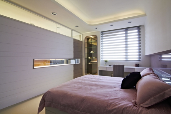 除了運用色彩來提升空間氛圍,在窗邊則有展示櫃及書桌規劃,使臥室擁有更多便利機能,屋主可在此簡單使用筆電或賞玩收藏品;另外,將平台延伸至床頭,結合床頭烤漆玻璃色塊及桌几、床背裱布等設計,讓設計與機能融為一體。而床尾則利用與更衣間門片及牆面展示洞作為裝飾牆,再運用光線的穿透增加雙邊互動感。
