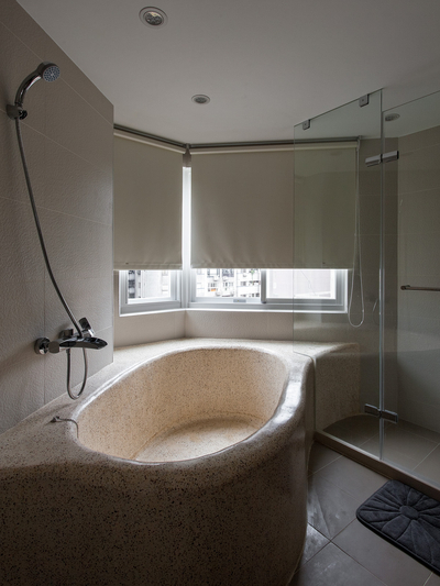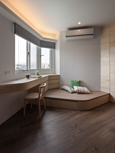 主臥以實木皮規劃主牆,將浴室門及儲藏間的門隱藏在實木皮的紋路中,陽光的照耀下空間自然散發出閒適氛圍。簡約的線條、田園風的色塊、黃色豐收的意象,充足的光線、開放式的公共空間。愈簡單的幸福愈難規劃,因為那不是將所有最昂貴的建材、皮草、家飾可以混搭出來的。