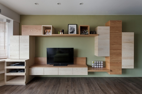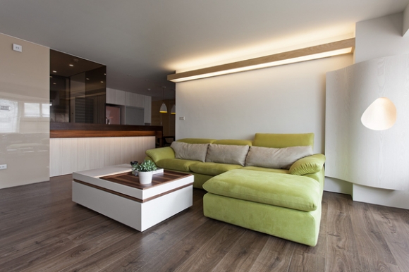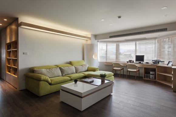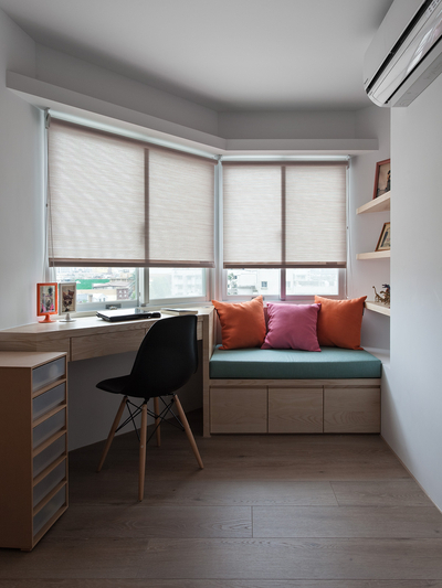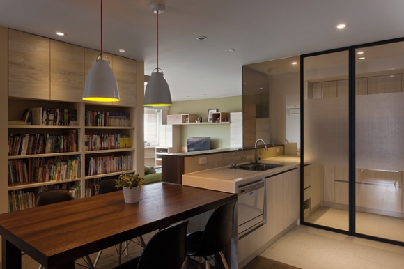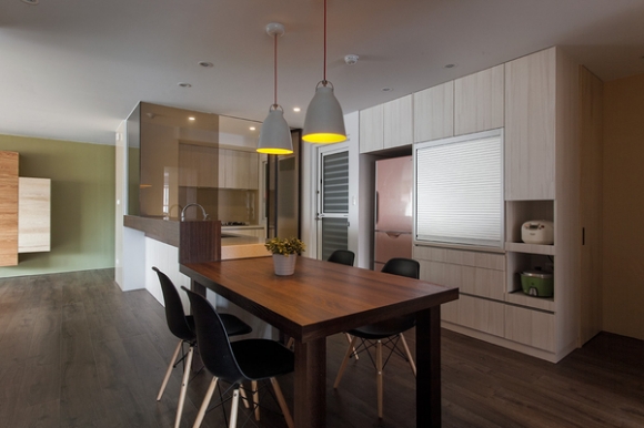 以質樸隱逸為設計的發想,客廳主牆面刷上令人放鬆的綠,映襯染白實木皮及實木皮本色所組成的電視櫃,溫暖的陽光漫入室內,空間自然散發出田園閒逸的氛圍。客廳窗邊有書桌區,小朋友看電視時,爸媽在一旁用電腦辦公,依然可陪伴小孩。餐廚區的走廊規劃一道書牆,餐桌同時也是書桌,提供全家人一同閱讀的空間,也培養小朋友的閱讀習慣。