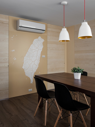 屋主有兩個學齡小孩,平常屋主太太熱愛烹調,因此我們特地將廚房熱炒區以玻璃做為隔間,讓女主人在烹調的同時,也能關注在小朋友的一舉一動。餐廳的壁面以319鄉鎮的地圖期許一家人能夠造訪每個鄉鎮,深入了解台灣,珍惜這片土地,映襯地圖的黃色主牆象徵,秋收時一片稻穀豐收的景象,和餐廳區域的意象能充分呼應。