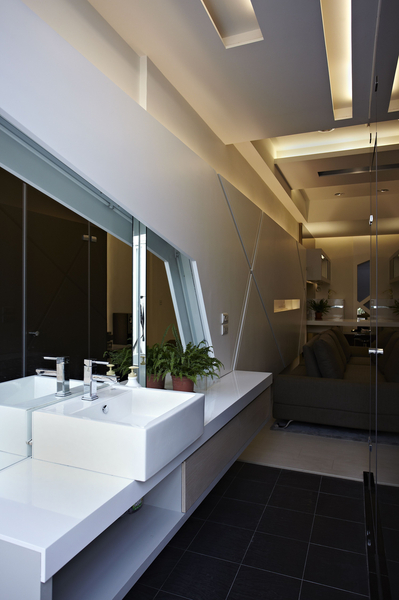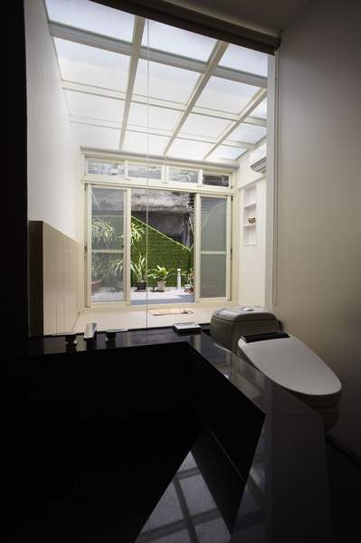 量身訂做的浴池讓不大的浴室恰可容納大泡澡區及馬桶位置,透明的隔間則避免狹隘感,同時也可盡情欣賞和室採光屋及戶外綠色景光,當然為了保有隱私感,玻璃隔間仍貼有隔熱紙並搭配捲簾設計。而移出浴室的洗手台則是延續視聽空間的壁面設計,展現現代設計感。和室陽光屋主要作為泡湯後休憩用,設計上也充分利用壁面空間來增加收納機能。另一方面,在戶外部分則是考量與鄰棟棟距小、欠缺隱私感,因而特別設計綠色的圍牆,除了避免視覺穿透,也讓室內向外的景觀更具休閒感。