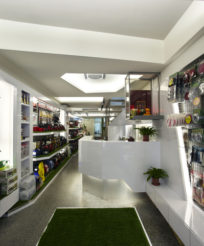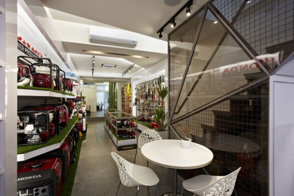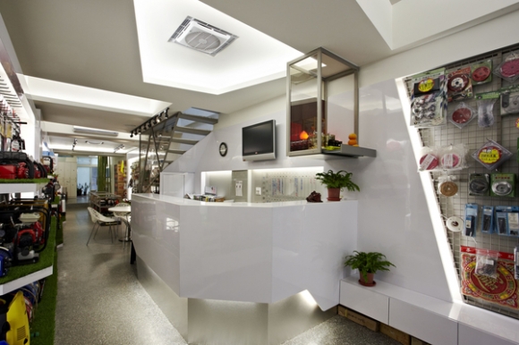 長屋是台灣早期街廓店面最常見的屋型,屋主利用一樓作為維修店面及商品展示區,而二樓則設置VIP貴賓室,主要用於洽談公務、招待貴賓,呈現出與一樓不同的休閒氛圍。由於兩側房屋比鄰相接使橫向格局受限,加上一樓店面需要利用牆面架設層板作商品展示,因此,讓長屋的格局雪上加霜;同時,因左右無法開窗、只有前後有採光,更讓室內中段顯得陰暗不舒適,為了徹底改善種種問題,設計師除了打開了室內大部分格局外,同時將前後牆也一併改為玻璃牆,引入戶外的光與景,也使室內格局能有透氣呼吸的感覺。