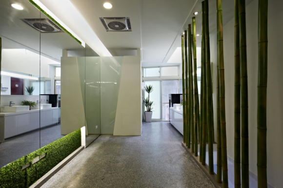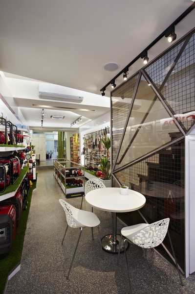 利用辦公區、樓梯旁與會議區之間的過渡空間,安排有放鬆一下的茶水座區。設計師在原本樓梯扶手位置,設計了鋼構、鋼網及玻璃材質的造型牆面,搭配現代素材的白色家具,提供客人洽談的座區,也成為串連空間的景緻之一。老實說,明亮白色的空間感、加上層板上覆上草皮設計就已轉化了店內重機械的傳統印象。利用通往地下室樓梯的小空間排設了竹牆,連接後端的洗手台檯面,以及玻璃後門引進的陽光,創造了一片靜土,卻又不失原本產品屬性,相當別緻!