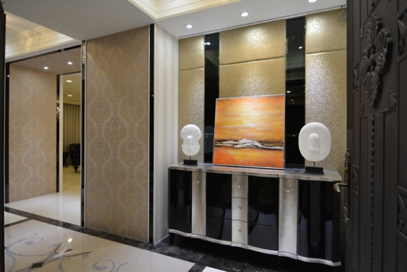 新成屋沒有翻新的問題,而且因建商格局規劃適當,室內空間也夠大,設計師在不改變格局的條件下,將預算完整的運用在屋主喜愛的設計風格表現,以及女主人的收納需求。一進門玄關以墨鏡、繃布勾勒出的端景,呈現出新古典風格下的精工內涵;客廳主牆選擇紋理內斂的石材,加入現代語彙,重新定義奢美大宅的迷人雅韻。