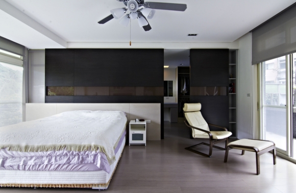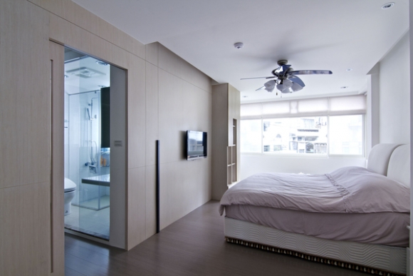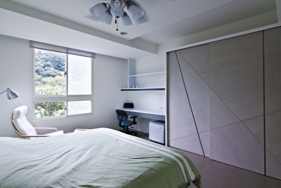 主臥室最大改變在於將外牆做內移設計,好讓出一方可走出室外賞景的陽台,同時將原本小窗改為落地式鋁窗結構設計,讓戶外自然景緻完全可引入室內,空間更變得無限寬廣。次臥室內同樣配有更衣間與專屬浴室的舒適格局,並以淺色木皮搭配白牆展現溫暖色調,整個電視牆如畫布般地運用幾何線條做細緻的切割設計,而更衣間內則運用清玻璃來呈現穿透的清爽氣氛。