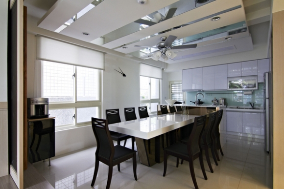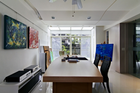 屋主平日,不需要大客廳,因此,決定將舊格局的客廳位置改為畫室,而遇到有藝文好友來訪可在寬敞的畫室中賞畫、聊天,或者輕鬆點移駕至開放餐廳或和室中,展現不流於制式的待客之道;同時因架高地板的和室擁有滿窗的綠意庭園,只需簡單一壺茶酒,就能讓美好時光在此停駐。至於餐廳的位置雖未更動,但因放大尺寸的窗框使戶外景致更大方地引入室內,加上通透設計的吧檯廚房讓用餐氣氛更加活絡、互動更好。餐廳與廚房合一的空間感更為通透開闊,並且將廚房改以白色烤漆與玻璃壁板設計,呈現出清麗的明亮氣氛。將原有的二扇窗戶尺寸放大,實現庭園餐廳的綠意與優閒感。