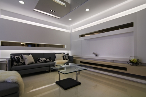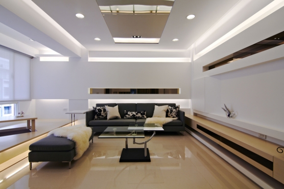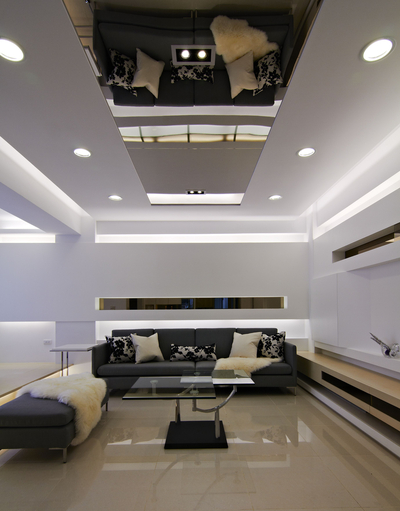 首先,將原本沿大門走道軸線而放的沙發改至原來電視牆位置,使客廳與餐廳之間以無形走道做區隔,但視線仍具有穿透性;而電視牆則創意地與沙發呈L型排列,此設計讓原受限於外牆寬度的電視牆立即變寬1.5倍達4.6米寬,不亞於一般中型房宅客廳面寬,這也讓來訪的客人不相信這房子竟然僅有28坪。此外,利用天花板、壁面的鏡影反射效果來改善屋高較低及空間較窄的問題,加上部份玻璃穿透的設計,使得整個房子不僅便寬敞、舒適,而且也更有現代設計感。