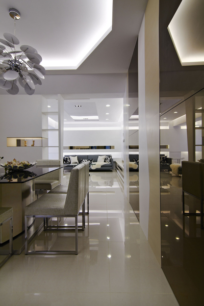 巧妙掌握隔間與開放的分寸,讓餐廳與客廳各有獨立區域、卻又能互為背景,增加空間景深。此外,避開屋樑,運用幾何造型的天花板設計,讓餐區的屋高達最高點,而管線可收在週邊造型內。餐廳後端為開放小廚房及客用衛浴間,為了避開浴室門的不舒適感,將整面牆以墨鏡做噴砂線條處理,變成具鏡面反射效果的奢華樣貌,搭配白色圓片餐桌吊燈則呈顯浪漫感;另外,在畫面左側還可見到電器櫃設計來增加廚房收納機能。
