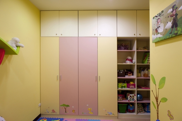 為了充足收納空間,從客廳延伸至餐廳的牆面則規劃為櫃體,和室地板下方更能容納大型物品,充分解決屋主的需求,另和室也是綜合性場域,兼具視聽、休憩及遊戲的功能。主卧室的床頭背牆以導弧壁面設計,化解床頭壓樑的風水問題;設計師並善用每一吋空間設置衣櫃,位於門片中間的立體壓紋腰帶是視覺的亮點之一。小孩房以鮮豔的鵝黃色漆面及可愛壁貼,營造專屬小朋友的童趣空間,而為未來考量的收納機能,亦是小孩房的重點。