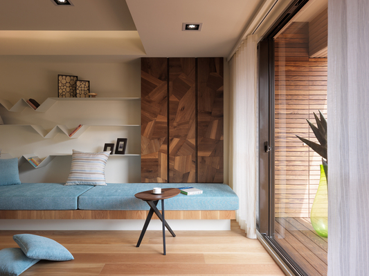 五樓為男主人專屬的休憩小天地,空間以水藍色為配色主調,以煙燻橡木和黑色鐵件組構書櫃,收納男主人的書籍及收藏品,讓男主人在疲累了一天後,可躺卧在沙發上看書、聽音樂,放鬆工作的壓力!