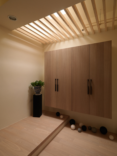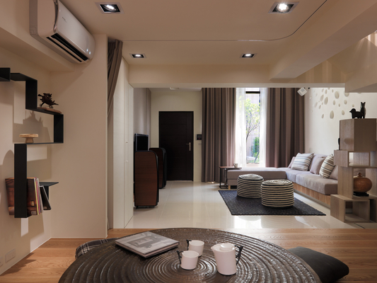 室內坪數雖然有80坪,但空間卻未發揮其坪數效用,設計團隊依據居住者的需求及生活習慣,規劃設計公領域及私領域。由於一家四口的感情相當融洽,加上他們希望能經常邀請父母北上聚會用餐,所以將原本一樓的書房規劃為客房使用,並運用褐色簾子和橡木地板做為客廳與客房空間的間隔,平日也可做為遊戲房,讓空間擁有極大的使用彈性。