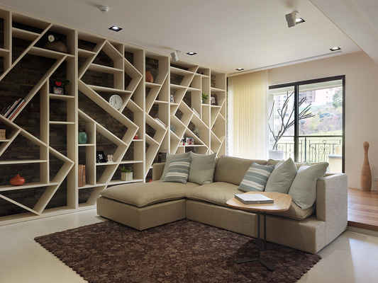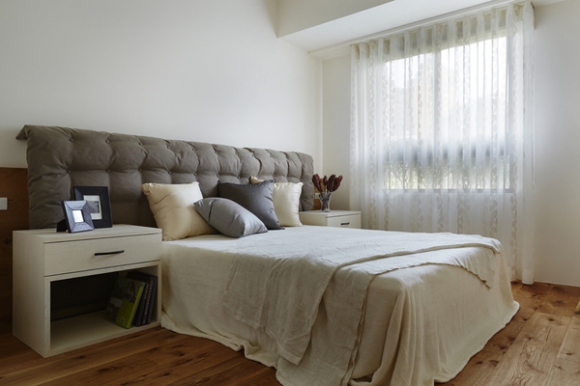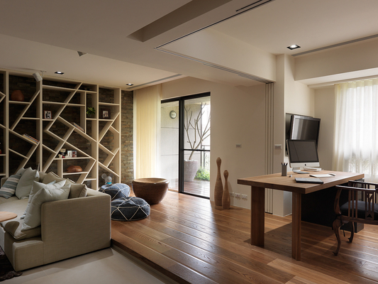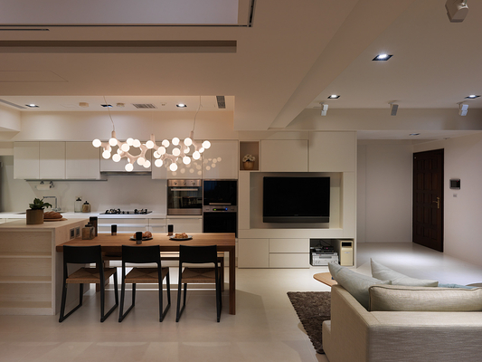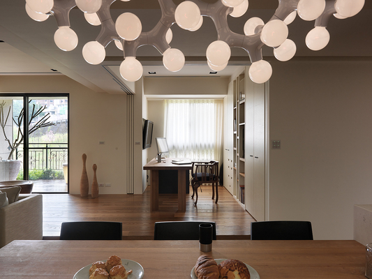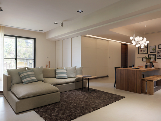 整體格局規劃為3房2廳,為了讓居住的空間能讓他們感到更放鬆自在,所以在公領域的部分以開放式設計,緊鄰客廳的房間則規劃為書房使用,中間則用活動拉門做為區隔,同時保有開放及獨立的效果。餐廳及廚房部分,以長形餐桌與吧檯,讓視覺動線能夠延展開來。為了讓使用者真正感到放鬆,主卧以白色、褐色為配色主調,只有在床頭板及抱枕有不同的變化,營造出乾淨純粹的氛圍。