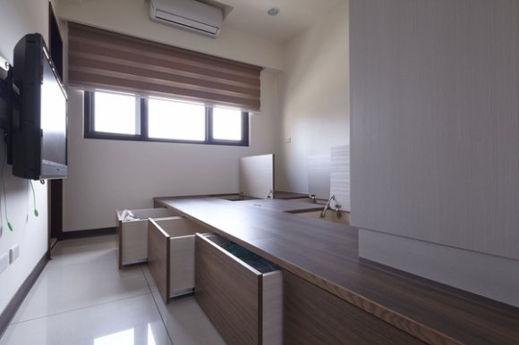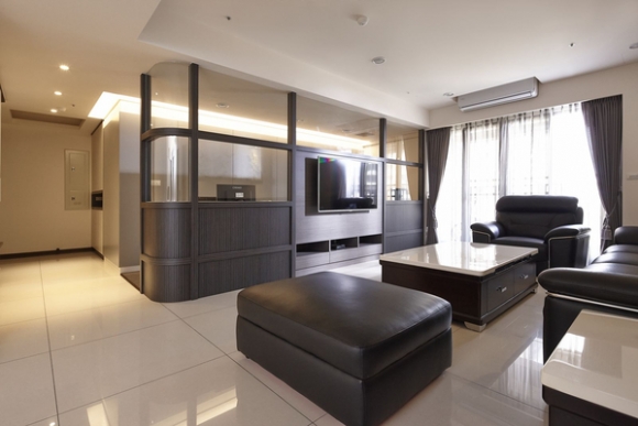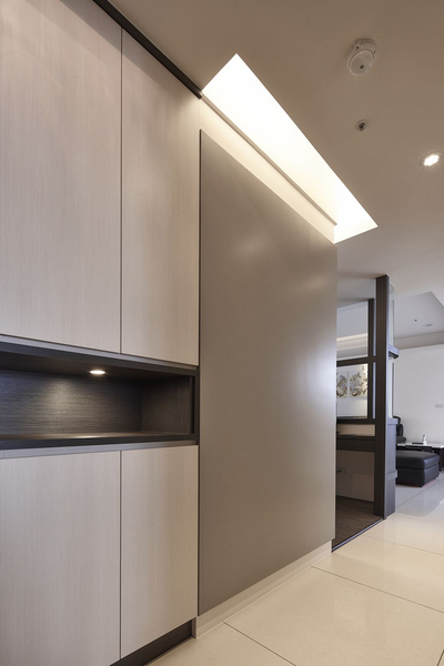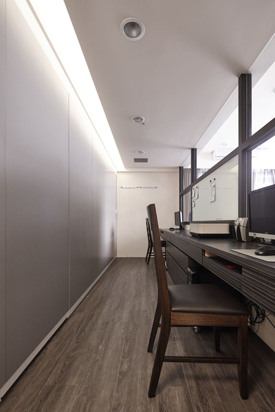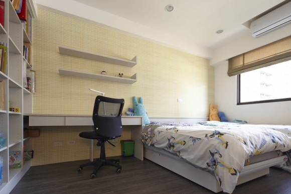 這是一家5口居住的新成屋,未來也希望與長輩一起住,原有4房格局,男主人期望能保有一間獨立的書房,因此漫舞空間設計的詹文雄、林育如設計師將緊鄰客廳的臥房隔間牆拆除之後,讓客廳空間略為退縮,創造獨立書房,並利用穿透的玻璃隔間結合深色木皮牆,營造放大的視覺效果。書房主牆與2個男孩共用的臥房入口,改為與牆體結合的隱藏門設計,讓空間更有整體感。