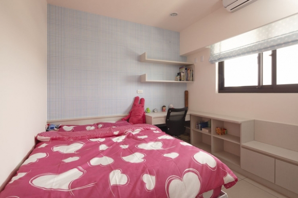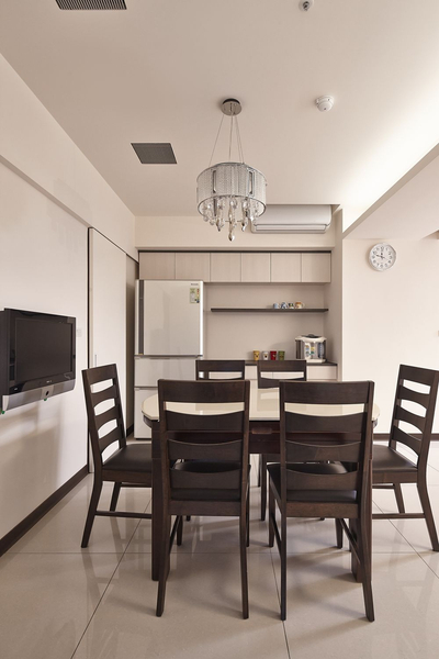 餐廳以白色為基調,並搭配特別吊燈,營造溫馨的用餐空間。男孩房利用低甲醛系統櫃規劃,確保居家健康與安全;女孩房使用相同圖案不同顏色的壁紙,帶出活潑的空間氛圍。為了能在將來與長輩同住,設計師在長親房用超耐磨地板設計架高地坪,下方增設抽屜、上掀式收納。可以作為小孩的遊戲間,親友來訪時便可充當客房,將來放上床墊就能是長親房了,讓空間利用更為靈活。