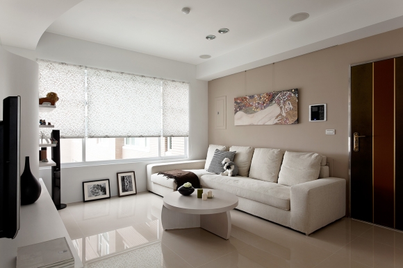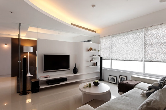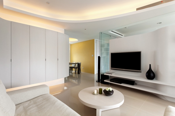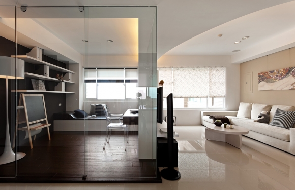 在客廳電視主牆的設計上,我們沒有大多華麗的裝飾,柔和的線條配上清玻,讓空間感更為輕盈,層板上讓屋主擺上屬於她回憶的小物,慢慢的這空間就會出現屋主的生活味。使用玻璃輕透材質及堅實的木頭裁切出如薄片的電視牆,替代寬厚的水泥,分隔客廳與書房,使兩邊的空間能夠最有效地得到利用。沙發背牆規劃為奶茶色,讓空間氛圍多點熱度回到家才有溫暖的感覺。