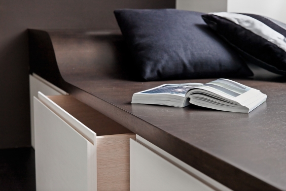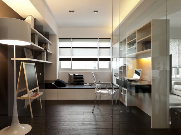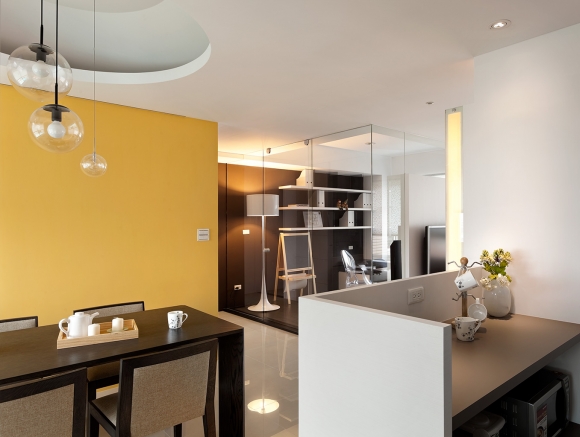 餐廳的顏色,選擇橙黃偏亮,給人微風和煦的陽光午後之感,讓屋主和朋友及家人用餐時,增進團聚在一起溫暖快樂的氛圍。書房牆面已深褐色搭配白色木作書架,深色牆壁讓景深更深,而木作書架看過去像是漂浮在空中了。書房臥榻規劃為大單人床的大小,平常可以坐在窗邊閱讀,客人來時可做為客人過夜休憩的地方。臥榻下的收納抽我們規劃為無把手設計,每一個規劃的小細節都是為了讓線條更有美感,空間感更為簡潔。