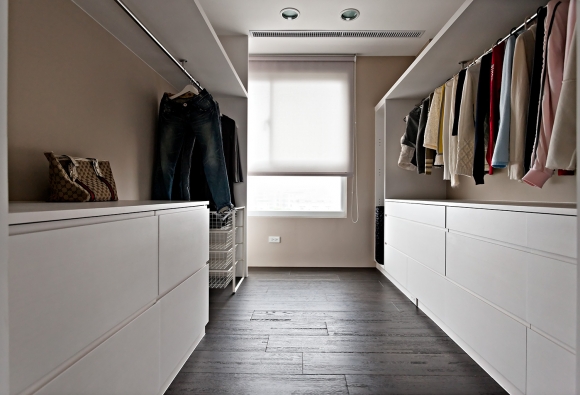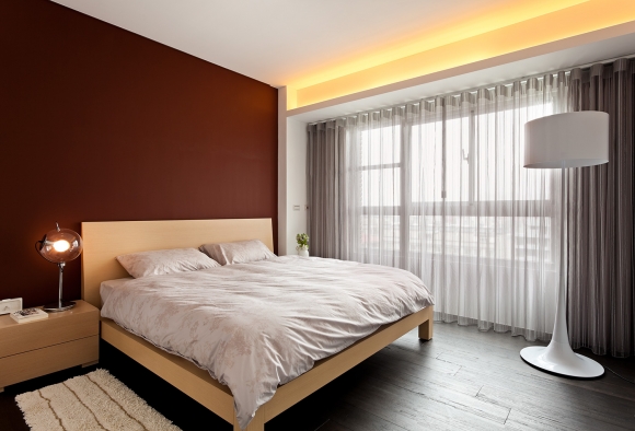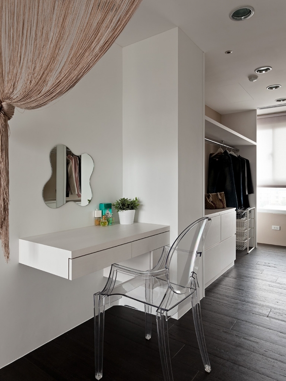屋主是個很理性又有包容力的人,主卧房床頭背牆用暗紅色來表現出屋主的理性穩重的那一面,在搭配上輕柔軟飾品,顯現出她溫柔的包容力。化妝桌規畫在浴室出入口,無論是洗完澡要馬上保養,或是化妝時有小出錯的地方要用到水都更為方便。在鏡子上我們也規劃了不規則的曲線來和公共空間的弧形曲線做為相呼應喔!