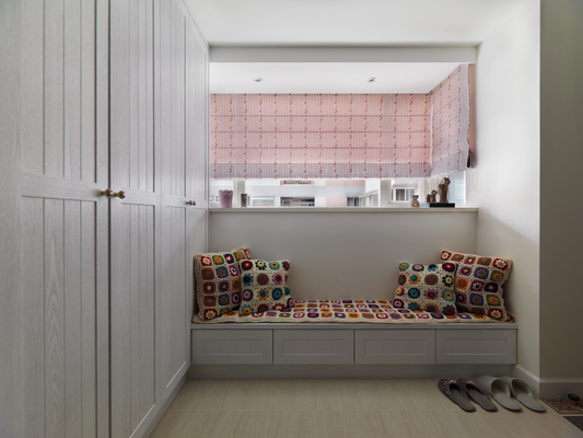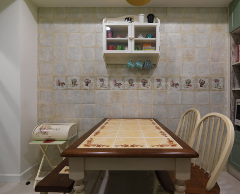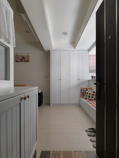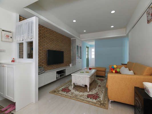 一進大門,玄關處的白色鞋櫃,搭配點綴了蕾絲材質的通透感屏風,營造溫柔和精緻的視覺印象,一旁則開窗引進光線,讓卧榻及穿鞋區能有明亮的感受。客廳區域以黃、白兩色,營造溫暖鮮明氣氛,並以大面積立體黃磚組構電視牆,搭配壁面的局部淺藍色調,給予人如藍天般自然自在的氛圍。餐廳則以復古磚鋪陳牆面,呈顯純樸的鄉村風,並搭配特色餐桌椅及吊櫃,整體畫面對稱工整。