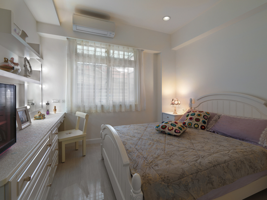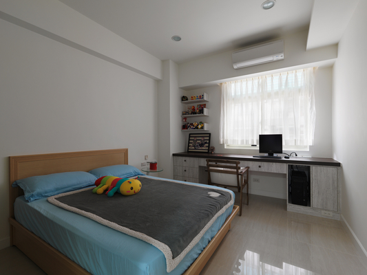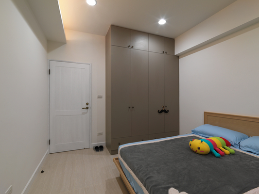 主卧以大片的白色為配色基調,為休憩空間帶來無壓的感受,並於床尾處設置流暢延伸的收納機能櫃體,妝點以透光窗簾及金屬色澤把手,流露出不同於制式設計的質感。小孩房則不做太多繁複的設計,只規劃了白牆、矮床等,並設置一座大型衣櫃,以滿足大容量的收納需求。