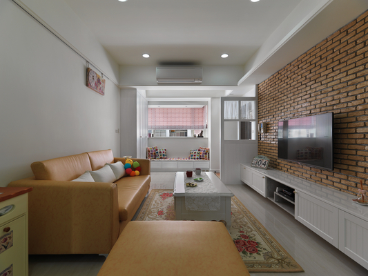 主要建材:系統櫃、木皮染白、文化石、耐磨木地板