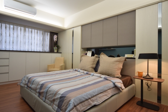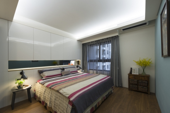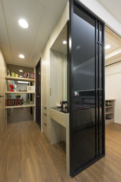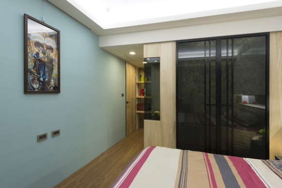 於公領域空間採完全開放設計,以家具區隔動線,亦能使展示櫃上的模型一覽無遺,而空間中少了實牆阻礙,家人間互動也更頻繁。主臥室則因女主人有不同的風格喜好,採不與LOFT風衝突的北歐風格設計,床頭背牆為白色鋼烤門板,搭配明亮穩定的Tiffany藍,使空間有不同的視覺感受。次臥房則以白色為基調,床頭的大象灰馬鞍皮革與黑鏡延續了主臥氛圍。