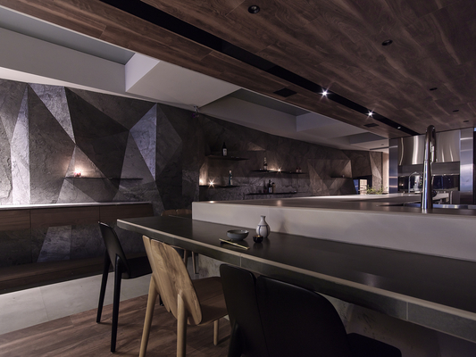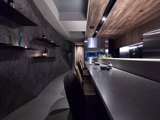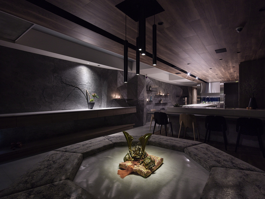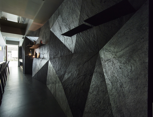 在設計上總監為了挑戰不同的空間視覺效果,在入口佈置窗櫥的效果,打破日本料理神袐封閉的門面採用大面窗景效果,入口的八角升降桌放低可供展室佈置,升高可供八人用餐。吧台對面延伸的立體石板牆面串起空間主題,打破既有日本料理吧台印象,取消冰箱在吧檯上的既有操作模式,打開料理者與客人間的距離,料理即是一種表演,師傅誠心為客人準備食材。搭配客人聚餐的需求,規劃非吧台位置,入口的八人桌及具隱私效果的包廂區。