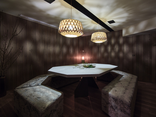 木紋的溫度使得餐廳回到最原始的味道,做出最溫暖人心的料理,不再誇張的修飾,顏色不再那麼強烈,線條不再複雜,不論主廚或用餐者皆可以沉澱,沉浸在這空間。藉此層次的氛圍轉化成享受於表演後的餘韻,帶給用餐者更深層的情緒感受,形成料理與空間美好的畫面。