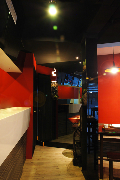 以白色調為主的建築外觀,以鮮紅色幾何色塊點綴其間,以搶眼的色調表達出現代感。店內空間則以木地板舖陳,營造出視覺上的質樸溫潤感,加上大面的吸睛紅色牆面及造型嵌燈和吊燈,在燈光和彩度的調和運用下,整體用餐環境呈現出溫暖而明亮的氛圍。而在家具及天花板的選用上,則是適度的加入深色調,傳達低調時尚的氣度!