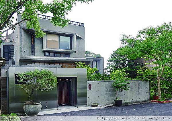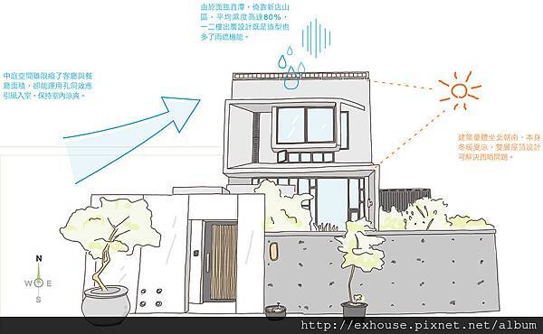由於面臨直潭,倚靠新店山區,平均濕度高達80%, 一二樓出簷設計既是造型也多了雨遮機能。