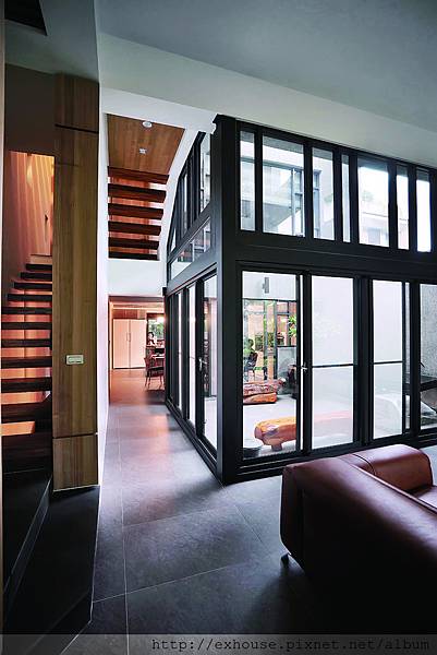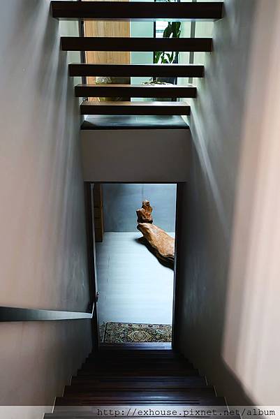5 從一樓往上往下都是一層, 關照屋主退休後的動線,隔柵式樓梯板讓光線交織成一幅畫,而通往二樓的轉角處則是歇息的一塊淨土。