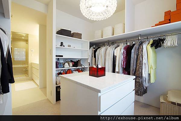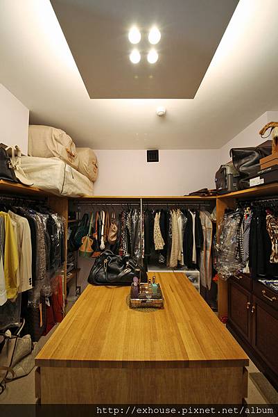 更衣間有四個方向可以放置衣服,中央的大桌子上可以把明天要穿的衣物排列放好。而中央大桌子有很多可以放置小物品的抽屜。這是大樓住宅改裝時,屋主提出希望可以實現夢想中的衣物間。