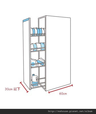 一般廚房配件多有既定尺寸,整體規劃難免會遇見狹窄尷尬的剩餘畸零區,這時可選用一些窄寬度的側拉籃填補此一缺口並賦予收納機能,最常見寬度以30 公分以下為主,另有50、75 公分等,但較少用,深度則會配合廚具做到約60 公分。