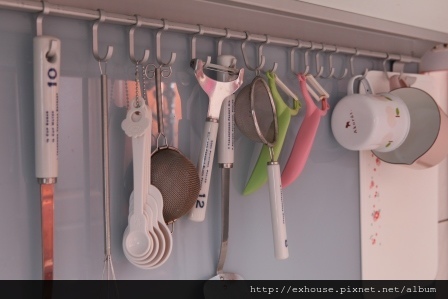 除了製訂櫃體之外,上櫃與下櫃的「中間地帶」也一定要好好利用,規劃簡易簡易磁條吸附刀具鍋鏟,或以橫桿、鐵板搭配懸掛式五金收納剛洗好的湯杓、杯具、砧板、鍋蓋等,都是不錯選擇。