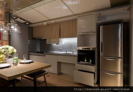 利用餐櫃或電器櫃來加設可拉出的抽板,就可以順利為餐廳或廚房爭取多點工作平檯;此外,吧檯的延伸桌板同樣可增加使用檯面,無論料理食物或用餐都更寬綽。
