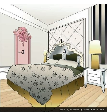(2) 華麗線板裝飾的門片強化了存在感,門對床亦造成風水煞氣,可能會影響在此睡臥者的健康。