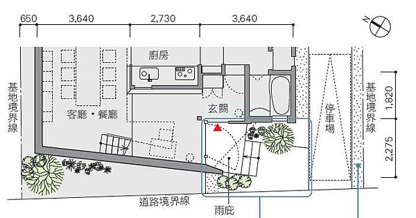 藍框內: 雨庇通往停車場的動線角度有變動。設置植栽與樓梯,可以轉換心情後進入玄關。