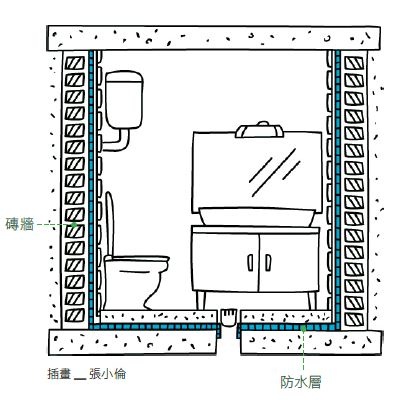 若浴廁是以磚牆隔間時,防水層施作必須從底部至天花板做滿為止。衛浴防水層的施作通常是以彈性水泥在貼磚前預先施作至少兩層。
