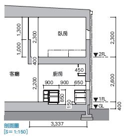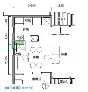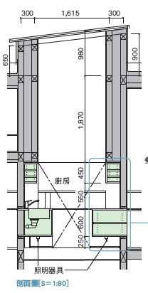 上拉線:只要將廚房一側的地板高度降低150㎜,在廚房料理的人就能和坐在餐桌的人視線剛好相對,方便雙方對話。