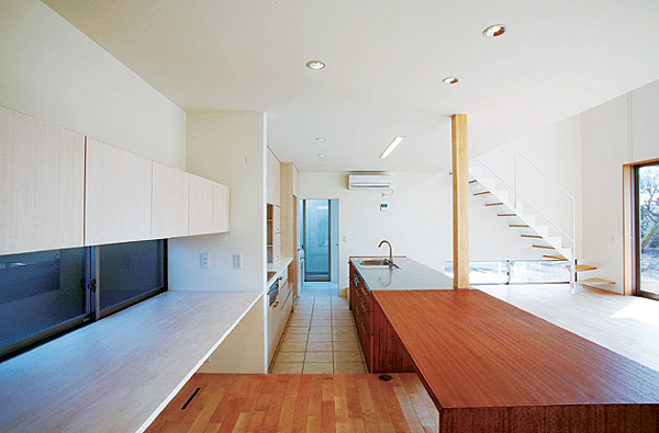 將廚房離開牆壁設置成中島,這樣動線就不會有死角。如果是要跟孩子一起做料理,多人作業時會相當方便。若想要有開放式廚房,卻又擔心煮菜的油煙跟味道,可以將瓦斯爐等器具設在靠牆的位置,水槽則設在中島上。