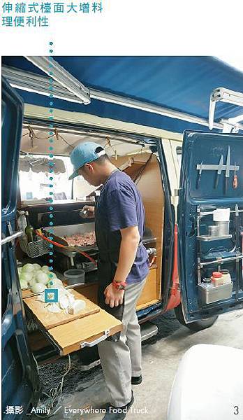 料理區所需機能不單只有爐火設備,像備料時所需的切菜檯面、簡單置物抽屜等,這些均以隱藏式設計來應對,輕輕拉取便能展開使用,便於店主在移動環做料理,同時也發揮餐車的每處空間。