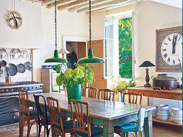 兩盞搪瓷吊燈低垂在餐桌正上方,濃濃的綠正適合田園